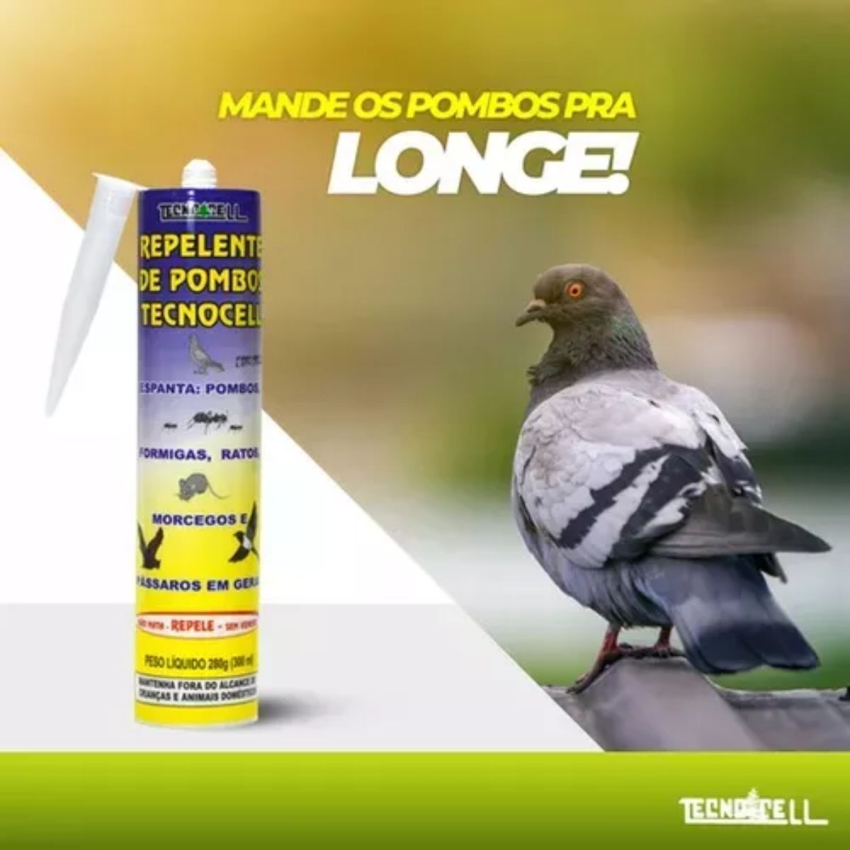 Repelente de Pombos Tecnocell é um produto na forma de gel, pronto para uso, formulado para maior durabilidade, mesmo exposto às condições ambientais adversas como temperatura, umidade, luz e raios ultravioleta, mantendo-se ativo. Poeiras e sujeiras podem diminuir a característica de aderência do produto, nesse caso, deve-se remover com uma espátula e reaplicar.