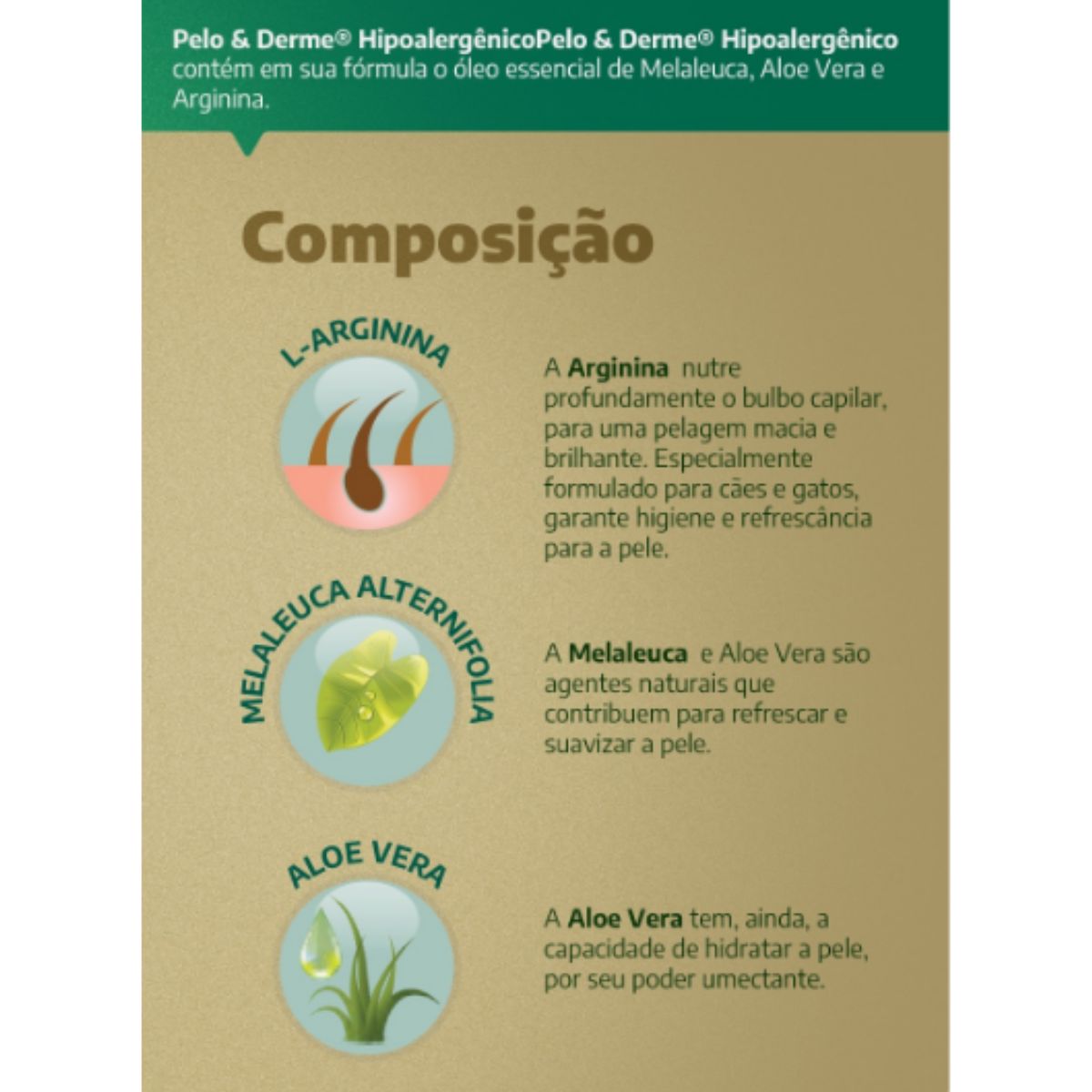 A formula exclusiva foi especialmente criada para pets que apresentam tendencia a alergias, irritacoes cutaneas ou pele ressecada. Diferente dos shampoos convencionais, o Pelo e Derme Hipoalergenico respeita o pH natural da pele dos animais, garantindo higiene completa sem causar desconforto ou reacoes adversas.
