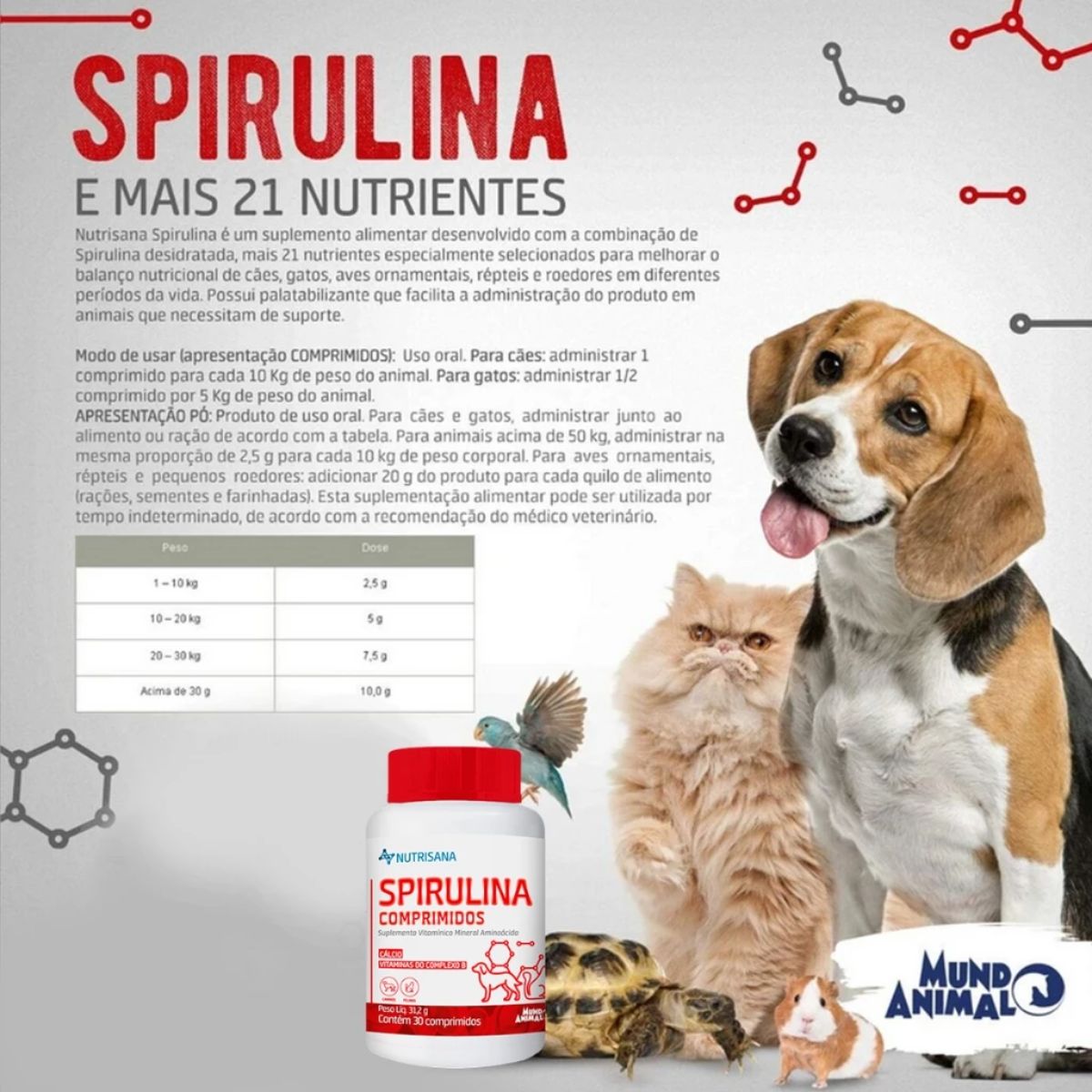 Nutrisana Spirulina é um suplemento alimentar desenvolvido com a combinação de Spirulina desidratada, mais 21 nutrientes especialmente selecionados para melhorar o balanço nutricional de cães, gatos, aves ornamentais, répteis e roedores em diferentes períodos da vida.