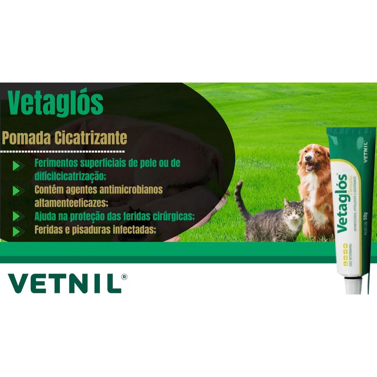 Vetaglos é a pomada cicatrizante de confiança desenvolvida pela Vetnil, referência brasileira em saúde animal há mais de 30 anos. Formulada especialmente para acelerar a cicatrização de feridas, cortes, queimaduras e lesões de pele em cães e gatos, oferecendo proteção e recuperação eficaz.